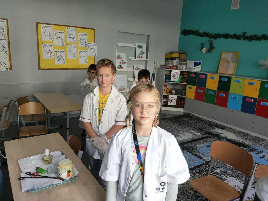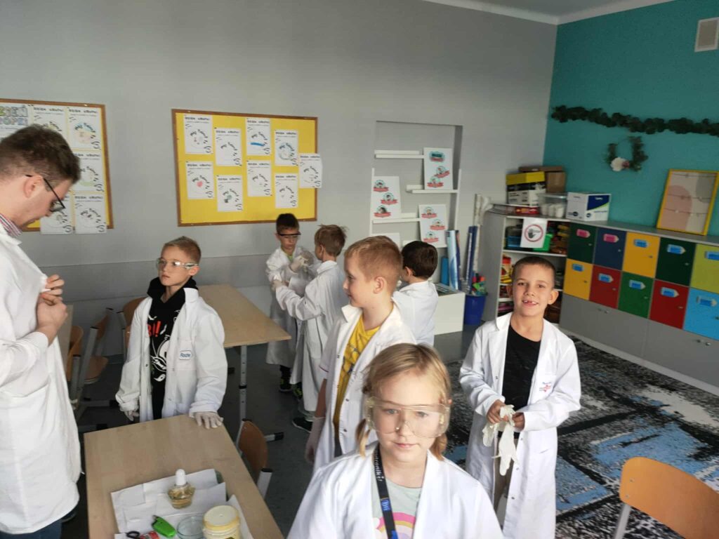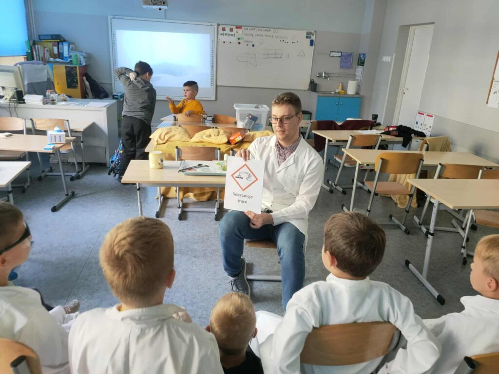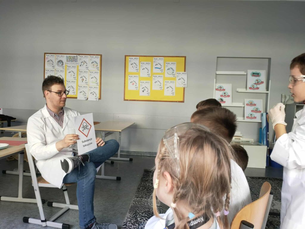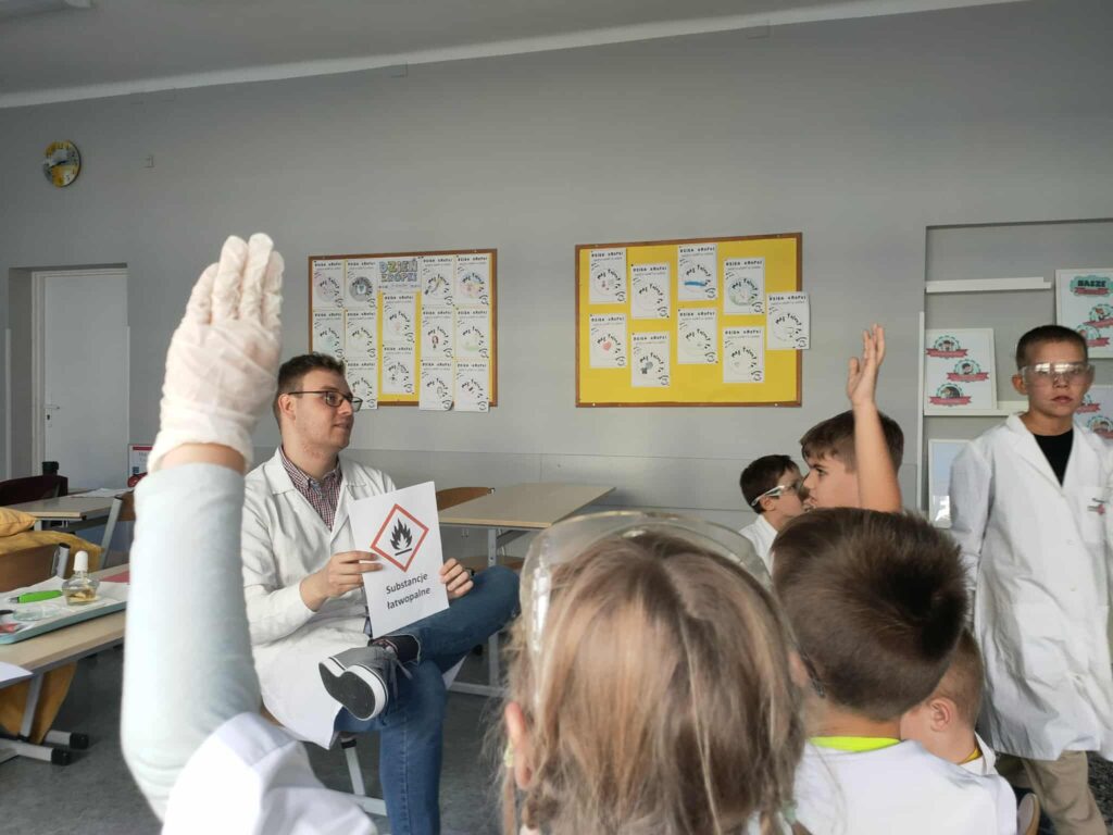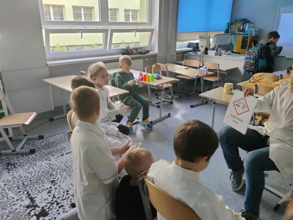 Niedawno w świetlicy szkolnej odbyły się wyjątkowe zajęcia pełne chemicznych eksperymentów, które poprowadził Pan Piotr Pecyna, nasz nauczyciel chemii. Dzieci miały okazję nie tylko świetnie się bawić, ale także zdobyć cenną wiedzę o tym, co oznaczają różne symbole i oznaczenia na produktach chemicznych.