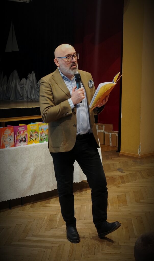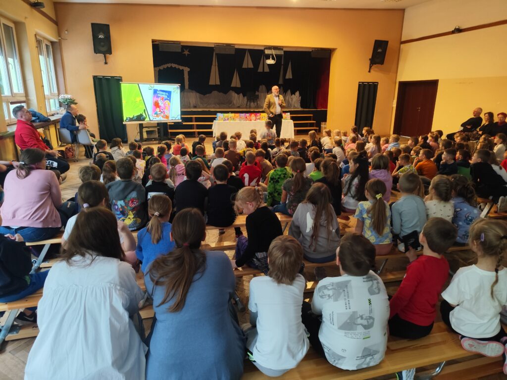 Uczniowie mieli okazję poznać kulisy powstawania książek, zadać pytania autorowi, posłuchać zabawnych historii i oczywiście zdobyć autografy. Spotkanie upłynęło w radosnej, pełnej śmiechu atmosferze i było prawdziwą ucztą dla młodych miłośników czytania.
