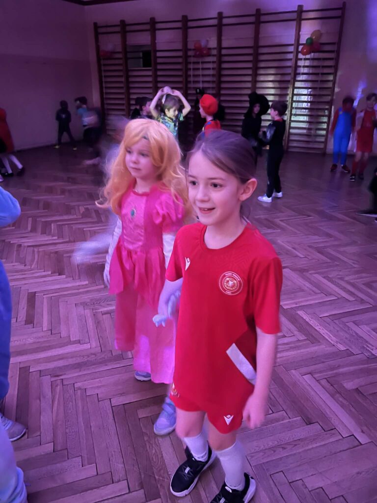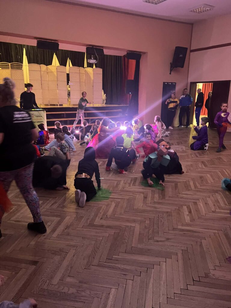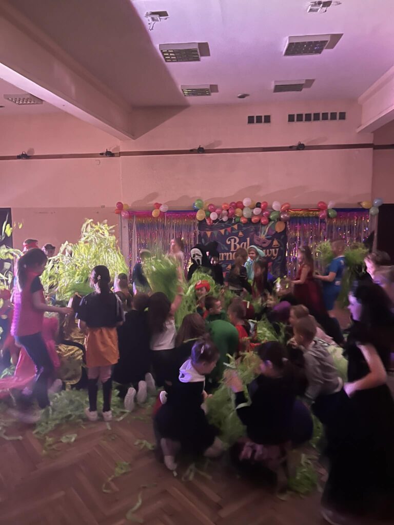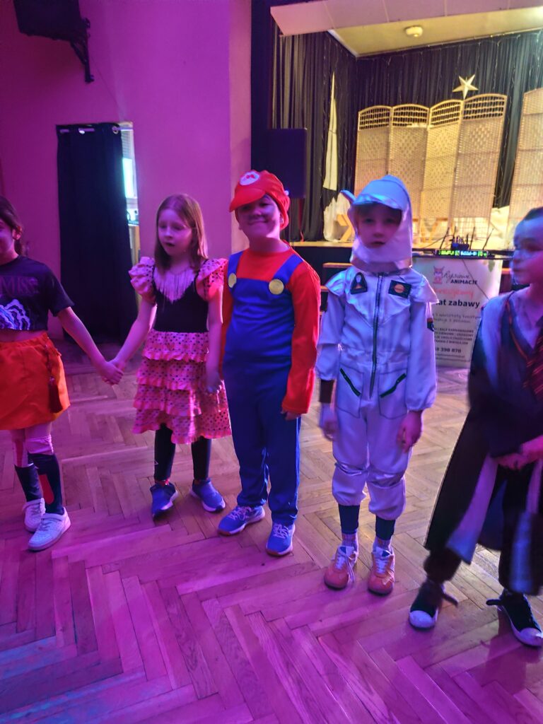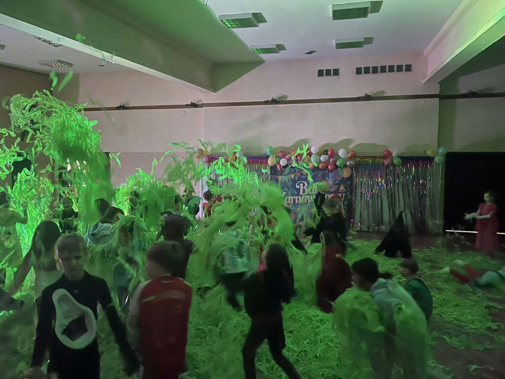 Sala zamieniła się w prawdziwą krainę zabawy – pełną kolorowych świateł, muzyki i… konfetti, które było dosłownie wszędzie 💚🎶 Dzieci zachwyciły kreatywnymi przebraniami: od księżniczek, superbohaterów i piłkarzy, po tajemnicze postacie rodem z bajek i filmów.