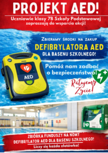 z radością informujemy o projekcie AED realizowanym przez uczniów klasy 7B Szkoły Podstawowej w ramach zajęć edukacji zdrowotnej. Celem inicjatywy jest zebranie środków na zakup nowego defibrylatora AED, który zostanie umieszczony na terenie basenu szkolnego. Urządzenie to znacząco zwiększy bezpieczeństwo wszystkich użytkowników obiektu, umożliwiając szybką i skuteczną reakcję w sytuacjach zagrożenia zdrowia i życia.
